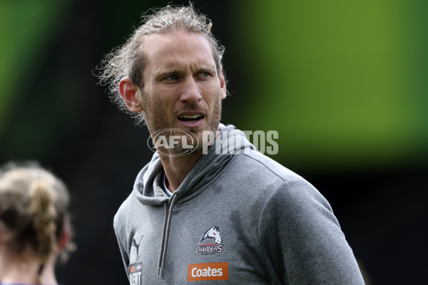 MELBOURNE, AUSTRALIA - SEPTEMBER 14: Tyrone Vickery, Head Coach, of the Chargers looks on during the Coates Talent League Girls First Preliminary Final match between Oakleigh Chargers and Dandenong Stingrays at Highgate Recreation Reserve on September 14, 2024 in Melbourne, Australia. (Photo by Martin Keep/AFL Photos)