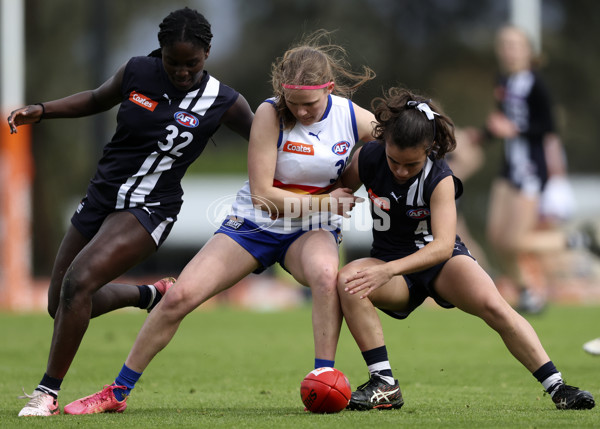 MELBOURNE, AUSTRALIA - SEPTEMBER 14: Hayley Wansbrough of the Ranges competes for the ball with Caitlin Charles of the Falcons during the Coates Talent League Girls Second Preliminary Final match between Geelong Falcons and Eastern Ranges at Highgate Recreation Reserve on September 14, 2024 in Melbourne, Australia. (Photo by Martin Keep/AFL Photos)