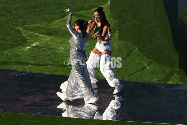 MELBOURNE, AUSTRALIA - SEPTEMBER 28: Katy Perry and Tina Arena perform during the AFL Grand Final match between Sydney Swans and Brisbane Lions at Melbourne Cricket Ground, on September 28, 2024, in Melbourne, Australia. (Photo by Morgan Hancock/AFL Photos)