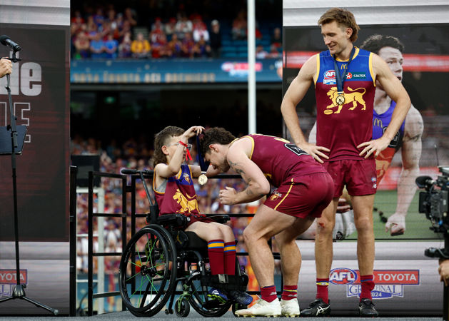 MELBOURNE, AUSTRALIA - SEPTEMBER 28: Lachie Neale of the Lions is presented with his medal by Alex Kouts, Auskicker of the Year during the 2024 AFL Grand Final match between the Sydney Swans and the Brisbane Lions at The Melbourne Cricket Ground on September 28, 2024 in Melbourne, Australia. (Photo by Michael Willson/AFL Photos)