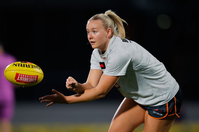 MELBOURNE, AUSTRALIA - OCTOBER 03: Annise Bradfield of the Giants warms up during the 2024 AFLW Round 06 match between the Melbourne Demons and the GWS GIANTS at IKON Park on October 03, 2024 in Melbourne, Australia. (Photo by Dylan Burns/AFL Photos)