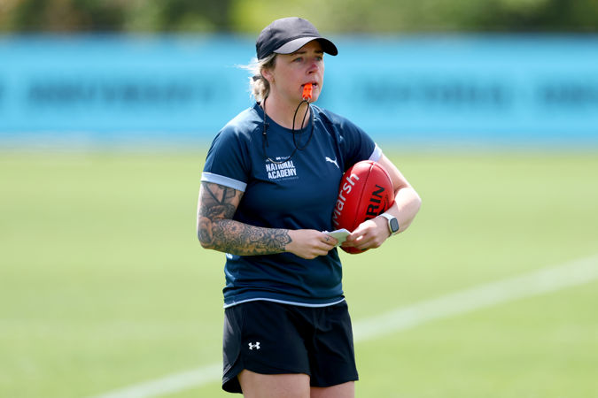 MELBOURNE, AUSTRALIA - DECEMBER 11: AFL National Academy Assistant Coach, Jess Wuetschner watches on during the 2025 Marsh AFL National Academy Girls training session at Whitten Oval on December 11th, 2024 in Melbourne, Australia. (Photo by Josh Chadwick/AFL Photos)