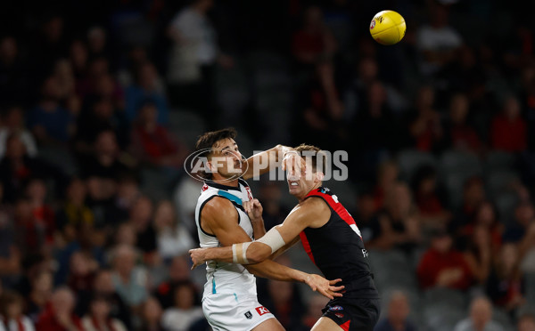 MELBOURNE, AUSTRALIA - MARCH 27: Ivan Soldo of the Power and Zach Reid of the Bombers compete for the ball during the 2025 AFL Round 03 match between the Essendon Bombers and the Port Adelaide Power at Marvel Stadium on March 27, 2025 in Melbourne, Australia. (Photo by Michael Willson/AFL Photos)