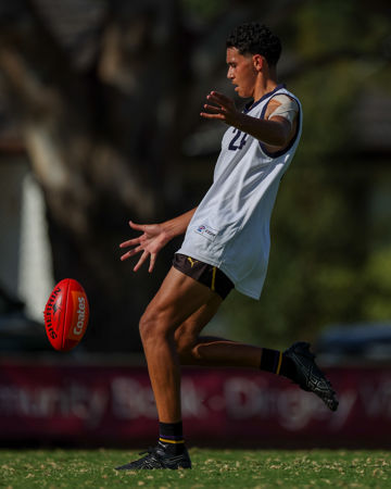 MELBOURNE, AUSTRALIA - APRIL 16: Jamaron Atkinson of Victoria Country kicks the ball during the 2025 Victorian Diversity All Stars Boys match between Victoria Country and Victoria Metro at Shepley Oval on April 16, 2025 in Melbourne, Australia. (Photo by Craig Dooley/AFL Photos)