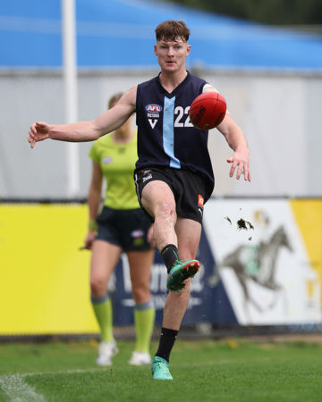 MELBOURNE, AUSTRALIA - APRIL 26: Cooper Herbert of Victoria Metro kicks the ball during the Young Guns 2025 series match between the Young Guns and the Victoria Metro U18 Boys at Melbourne Avalon Airport Oval on April 26, 2025 in Melbourne, Australia. (Photo by Rob Lawson/AFL Photos)