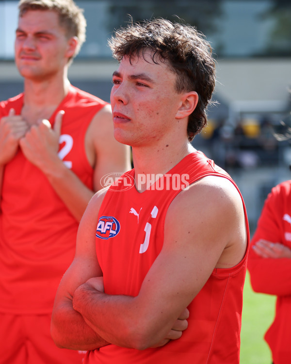 MELBOURNE, AUSTRALIA - MAY 04: Charlie Rozenes of the Young Guns listens in during the Young Guns 2025 series match between the Young Guns and the Victoria Country U18 Boys at Melbourne Avalon Airport Oval on May 04, 2025 in Melbourne, Australia. (Photo by Rob Lawson/AFL Photos)