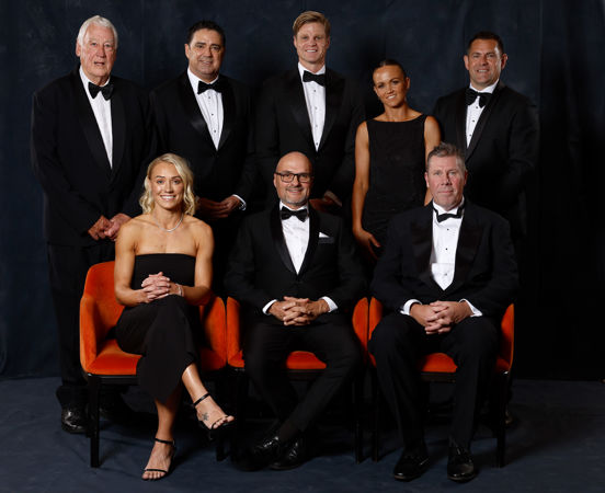 MELBOURNE, AUSTRALIA - JUNE 10: 2025 Inductees Back Row (L-R) Peter Darley, Garry Lyon, Nick Riewoldt, Daisy Pearce, Luke Hodge. Front Row (L-R) Erin Phillips, Matthew Farmer (Grandson of Ken Farmer, Hall of Fame Legend), John Leedham (son of John Leedham) ABSENT: Terry Owens (Grandson of George Owens) pose during the Australian Football Hall of Fame at Crown Palladium on June 10, 2025 in Melbourne, Australia. (Photo by Michael Willson/AFL Photos)