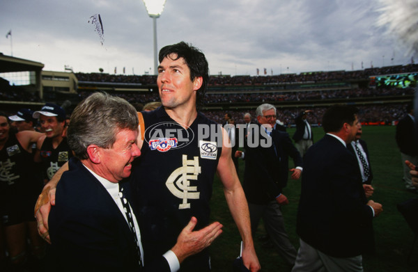 Col Kinnear and Blues captain Stephen Kernahan celebrate after winning the 1995 AFL Grand Final between the Carlton Blues and the Geelong Cats at the Melbourne Cricket Ground.