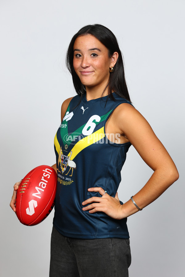 MELBOURNE, AUSTRALIA - APRIL 19: Mizuki Brothwell of the AFL National Academy poses during the Marsh AFL National Academy Girls Jumper Presentation at Mercure Albert Park on April 19, 2025 in Melbourne, Australia. (Photo by Josh Chadwick/AFL Photos)