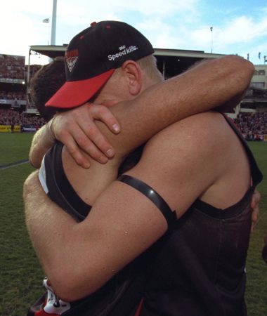 Michael Long for Essendon collides with Troy Simmonds #46 for Melbourne during the AFL Grand Final between the Essendon Bombers and the Melbourne Demons at the Melbourne Cricket Ground on September 2, 2000.