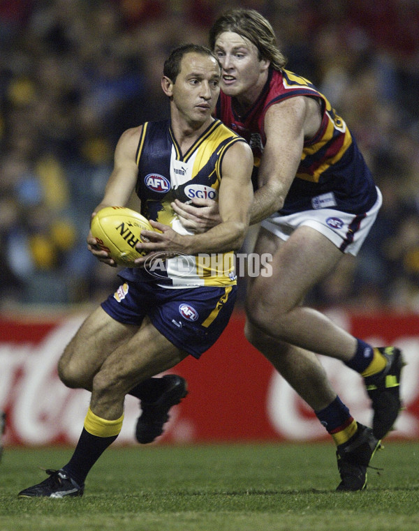 Phillip Matera of the Eagles in action against Trent Hentschel of the Crows during the round 12 AFL match between the West Coast Eagles and the Adelaide Crows at the Subiaco Oval June 12, 2004 in Perth, Australia.