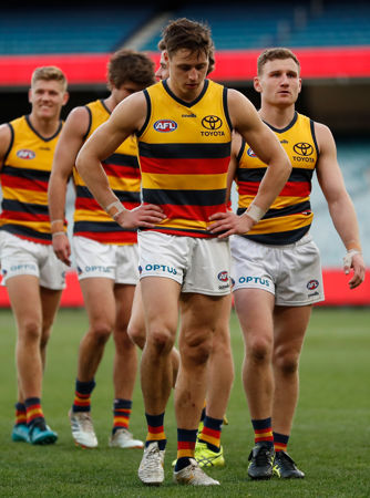 MELBOURNE, AUSTRALIA - AUGUST 15: The Crows look dejected after a loss during the 2021 AFL Round 22 match between the Melbourne Demons and the Adelaide Crows at the Melbourne Cricket Ground on August 15, 2021 in Melbourne, Australia. (Photo by Michael Willson/AFL Photos)