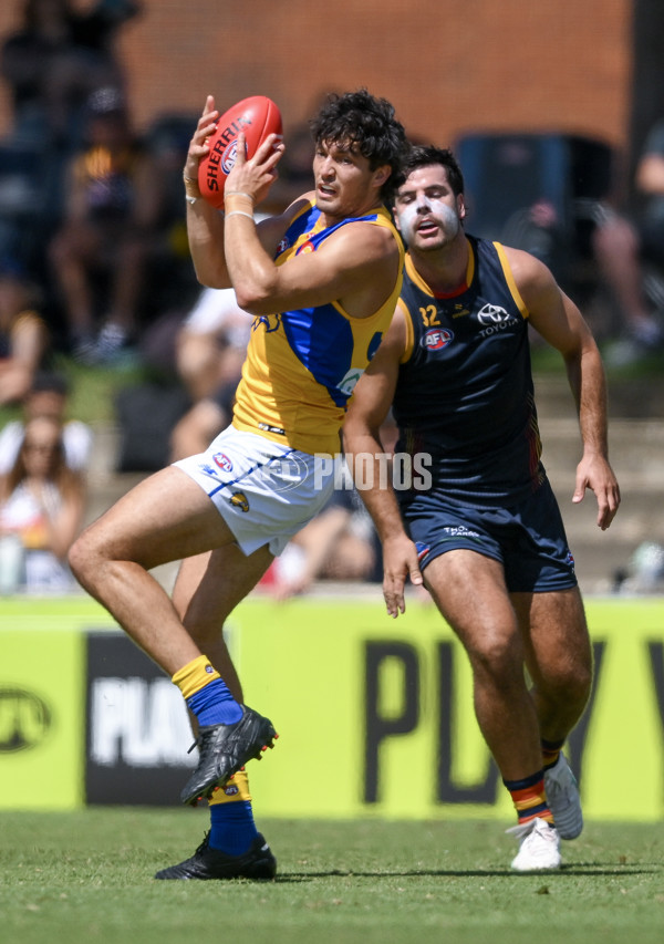 ADELAIDE, AUSTRALIA - MARCH 02: Tom Barrass of the Eagles marks in front of Darcy Fogarty of the Crowsduring the 2024 AFL Community Series match between Adelaide Crows and West Coast Eagles at Hisense Stadium on March 02, 2024 in Adelaide, Australia. (Photo by Mark Brake/Getty Images via AFL Photos)