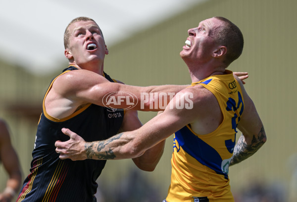 ADELAIDE, AUSTRALIA - MARCH 02: Reilly O'Brien of the Crows rucks against Bailey J. Williams of the Eagles during the 2024 AFL Community Series match between Adelaide Crows and West Coast Eagles at Hisense Stadium on March 02, 2024 in Adelaide, Australia. (Photo by Mark Brake/Getty Images via AFL Photos)