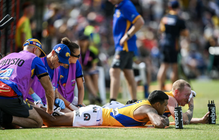 ADELAIDE, AUSTRALIA - MARCH 02: Darcy Fogarty of the Crows attempts to mark in front of Callum Jamieson of the Eagles during the 2024 AFL Community Series match between Adelaide Crows and West Coast Eagles at Hisense Stadium on March 02, 2024 in Adelaide, Australia. (Photo by Mark Brake/Getty Images via AFL Photos)