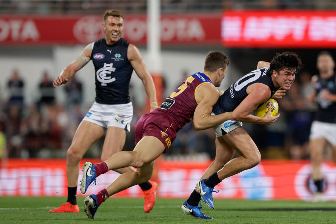 BRISBANE, AUSTRALIA - SEPTEMBER 07: Lachie Neale of the Lions in action during the 2024 AFL First Elimination Final match between the Brisbane Lions and the Carlton Blues at The Gabba on September 07, 2024 in Brisbane, Australia. (Photo by Russell Freeman/AFL Photos)