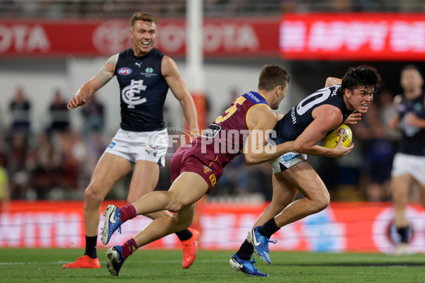 BRISBANE, AUSTRALIA - SEPTEMBER 07: Elijah Hollands of the Blues is tackled by Josh Dunkley of the Lions during the 2024 AFL First Elimination Final match between the Brisbane Lions and the Carlton Blues at The Gabba on September 07, 2024 in Brisbane, Australia. (Photo by Russell Freeman/AFL Photos)
