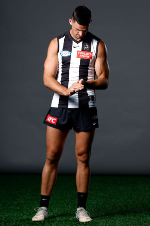 MELBOURNE, AUSTRALIA - FEBRUARY 08: Scott Pendlebury of the Magpies poses during the Collingwood Magpies 2024 Official Team Photo Day at the AIA Centre on February 08, 2024 in Melbourne, Australia. (Photo by Michael Willson/AFL Photos)