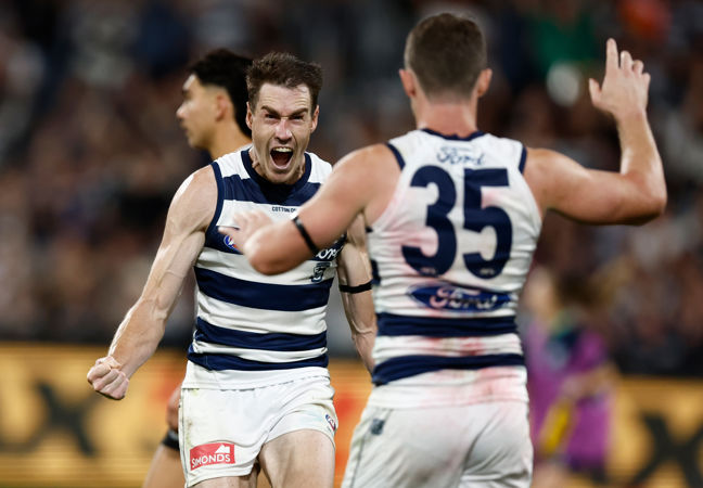 GEELONG, AUSTRALIA - MARCH 16: Jeremy Cameron (top) and Patrick Dangerfield of the Cats celebrate Dangerfield’s late goal during the 2024 AFL Round 01 match between the Geelong Cats and the St Kilda Saints at GMHBA Stadium on March 16, 2024 in Geelong, Australia. (Photo by Michael Willson/AFL Photos)