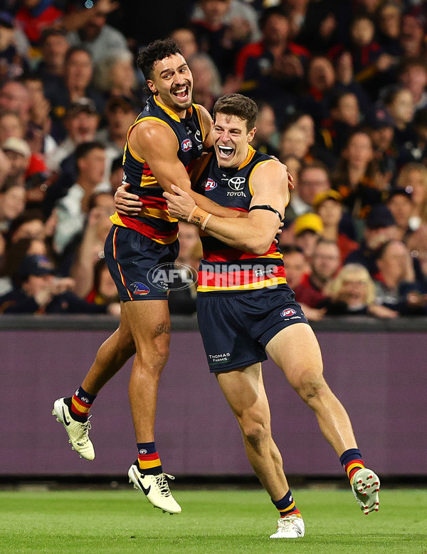 ADELAIDE, AUSTRALIA - MARCH 22: Chris Burgess of the Crows celebrates a goal with Izak Rankine of the Crows during the 2024 AFL Round 2 match between the Adelaide Crows and the Geelong Cats at Adelaide Oval on March 22, 2024 in Adelaide, Australia. (Photo by Sarah Reed/AFL Photos)