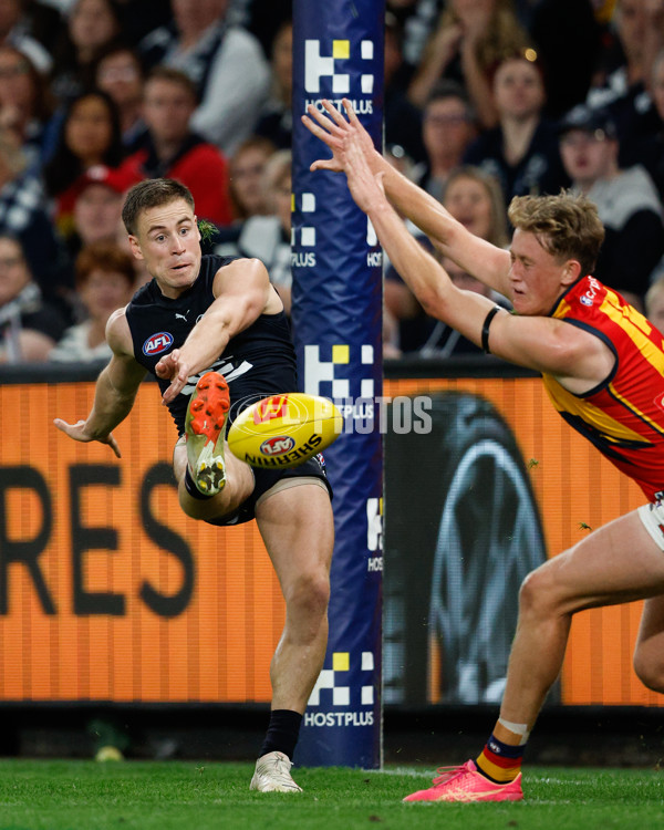 MELBOURNE, AUSTRALIA - APRIL 13: Matthew Owies of the Blues kicks the ball during the 2024 AFL Round 05 match between the Carlton Blues and the Adelaide Crows at Marvel Stadium on April 13, 2024 in Melbourne, Australia. (Photo by Dylan Burns/AFL Photos)