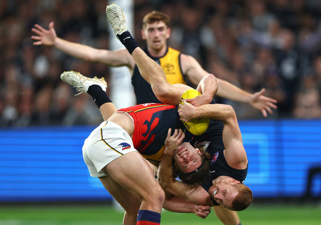MELBOURNE, AUSTRALIA - APRIL 13: Sam Berry of the Crows handballs whilst being tackled by Corey Durdin of the Blues during the round five AFL match between Carlton Blues and Adelaide Crows at Marvel Stadium, on April 13, 2024, in Melbourne, Australia. (Photo by Quinn Rooney/Getty Images via AFL Photos)
