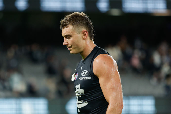 MELBOURNE, AUSTRALIA - APRIL 13: The Blues look dejected after losing the round five AFL match between Carlton Blues and Adelaide Crows at Marvel Stadium, on April 13, 2024, in Melbourne, Australia. (Photo by Quinn Rooney/Getty Images via AFL Photos)