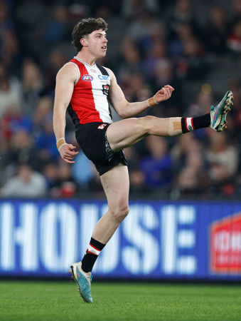 MELBOURNE, AUSTRALIA - MAY 04: Darcy Wilson of the Saints celebrates a goal during the 2024 AFL Round 08 match between the St Kilda Saints and the North Melbourne Kangaroos at Marvel Stadium on May 04, 2024 in Melbourne, Australia. (Photo by Michael Willson/AFL Photos)