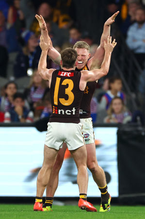 MELBOURNE, AUSTRALIA - MAY 05: Tom Liberatore of the Bulldogs leaves the field under the blood rule during the 2024 AFL Round 08 match between the Western Bulldogs and the Hawthorn Hawks at Marvel Stadium on May 05, 2024 in Melbourne, Australia. (Photo by Dylan Burns/AFL Photos)