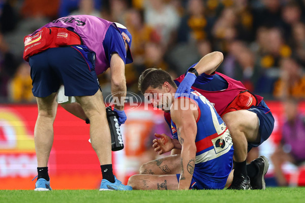 MELBOURNE, AUSTRALIA - MAY 05: Tom Liberatore of the Bulldogs is attended to by trainers during the round eight AFL match between Western Bulldogs and Hawthorn Hawks at Marvel Stadium, on May 05, 2024, in Melbourne, Australia. (Photo by Quinn Rooney/Getty Images via AFL Photos)