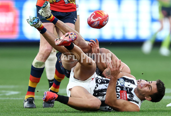 MELBOURNE, AUSTRALIA - MAY 18: Nick Daicos of the Magpies is tackled by Izak Rankine of the Crows during the round 10 AFL match between Collingwood Magpies and Kuwarna (the Adelaide Crows) at Melbourne Cricket Ground, on May 18, 2024, in Melbourne, Australia. (Photo by Quinn Rooney/Getty Images via AFL Photos)