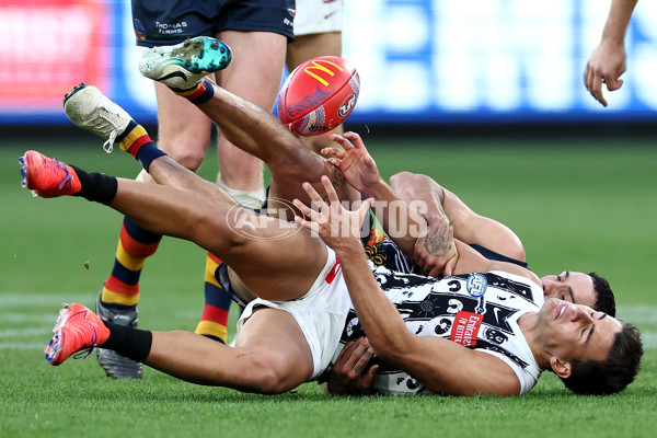 MELBOURNE, AUSTRALIA - MAY 18: Nick Daicos of the Magpies is tackled by Izak Rankine of the Crows during the round 10 AFL match between Collingwood Magpies and Kuwarna (the Adelaide Crows) at Melbourne Cricket Ground, on May 18, 2024, in Melbourne, Australia. (Photo by Quinn Rooney/Getty Images via AFL Photos)
