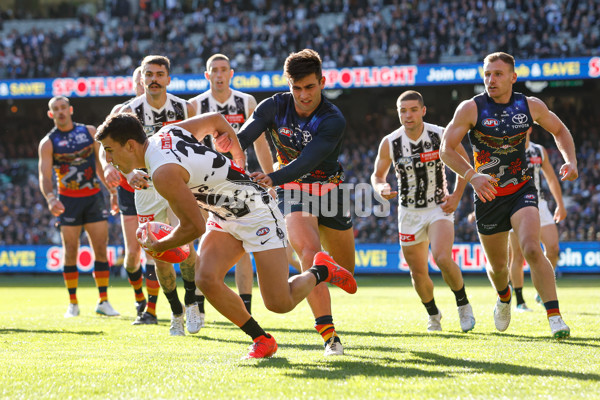 MELBOURNE, AUSTRALIA - MAY 18: Nick Daicos of the Magpies evades Josh Rachele of the Crows during the 2024 AFL Round 10 match between The Collingwood Magpies and Kuwarna (Adelaide Crows) at The Melbourne Cricket Ground on May 18, 2024 in Melbourne, Australia. (Photo by Dylan Burns/AFL Photos)