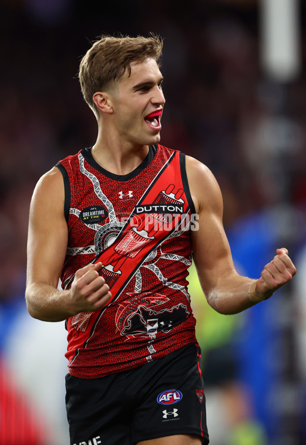MELBOURNE, AUSTRALIA - MAY 19: Matt Guelfi of the Bombers celebrates kicking a goal during the round 10 AFL match between Essendon Bombers and North Melbourne Kangaroos at Marvel Stadium, on May 19, 2024, in Melbourne, Australia. (Photo by Quinn Rooney/Getty Images via AFL Photos)