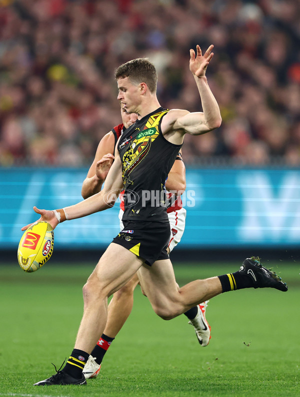 MELBOURNE, AUSTRALIA - MAY 25: Thomson Dow of the Tigers kicks whilst being tackled by Matt Guelfi of the Bombers during the round 11 AFL match between Richmond Tigers and Essendon Bombers at Melbourne Cricket Ground, on May 25, 2024, in Melbourne, Australia. (Photo by Quinn Rooney/Getty Images via AFL Photos)