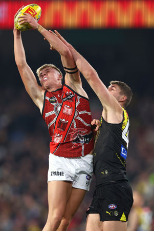 MELBOURNE, AUSTRALIA - MAY 25: Nate Caddy of the Bombers and Jayden Short of the Tigers compete for the ball during the round 11 AFL match between Richmond Tigers and Essendon Bombers at Melbourne Cricket Ground, on May 25, 2024, in Melbourne, Australia. (Photo by Morgan Hancock/AFL Photos)