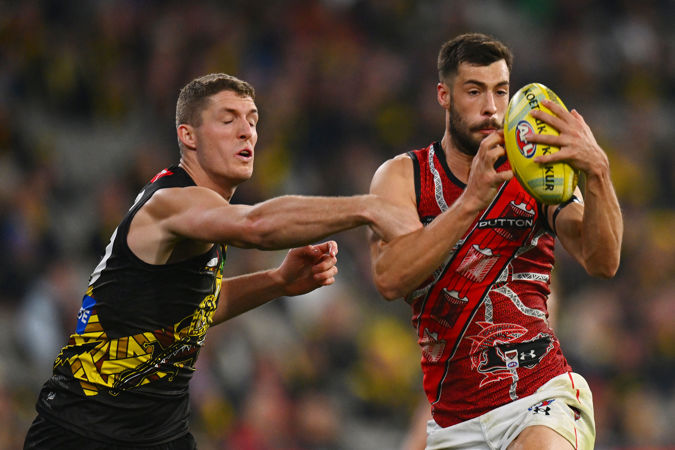 MELBOURNE, AUSTRALIA - MAY 25: Shai Bolton of the Tigers is helped from the ground by a trainer during the round 11 AFL match between Richmond Tigers and Essendon Bombers at Melbourne Cricket Ground, on May 25, 2024, in Melbourne, Australia. (Photo by Quinn Rooney/Getty Images via AFL Photos)