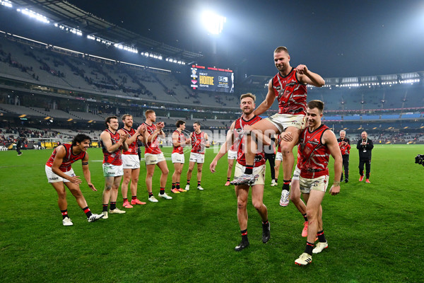 MELBOURNE, AUSTRALIA - MAY 25: Jake Stringer of the Bombers is chaired off after playing his 200th game during the round 11 AFL match between Richmond Tigers and Essendon Bombers at Melbourne Cricket Ground, on May 25, 2024, in Melbourne, Australia. (Photo by Morgan Hancock/AFL Photos)
