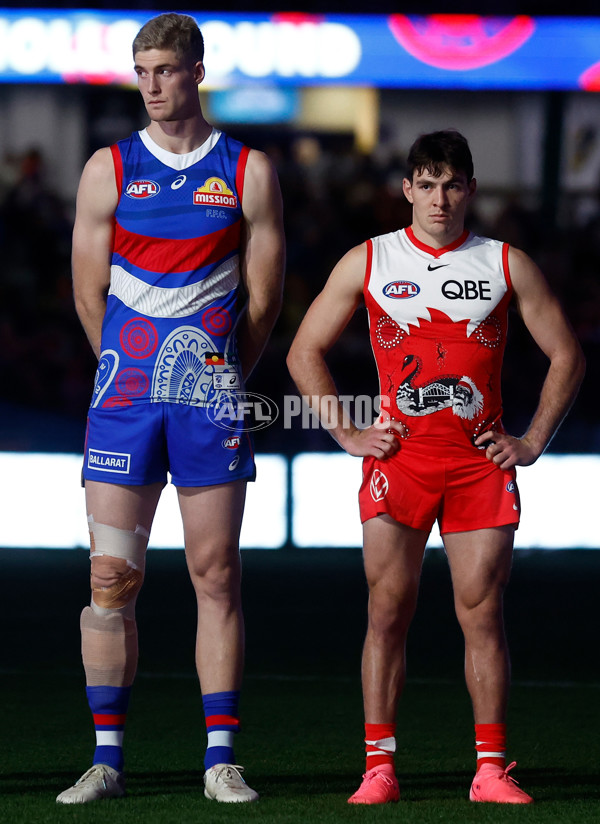 MELBOURNE, AUSTRALIA - MAY 23: Tim English of the Bulldogs and Errol Gulden of the Swans look on during Welcome to Country during the 2024 AFL Round 11 match between the Western Bulldogs and the Sydney Swans at Marvel Stadium on May 23, 2024 in Melbourne, Australia. (Photo by Michael Willson/AFL Photos)