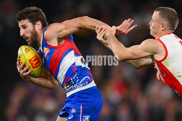 MELBOURNE, AUSTRALIA - MAY 23: Marcus Bontempelli of the Bulldogs evades a tackle from Chad Warner of the Swans during the round 11 AFL match between Western Bulldogs and Sydney Swans at Marvel Stadium, on May 23, 2024, in Melbourne, Australia. (Photo by Morgan Hancock/Getty Images via AFL Photos)
