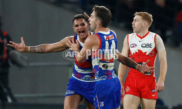 MELBOURNE, AUSTRALIA - MAY 23: Jamarra Ugle-Hagan (left) and Rhylee West of the Bulldogs celebrate during the 2024 AFL Round 11 match between the Western Bulldogs and the Sydney Swans at Marvel Stadium on May 23, 2024 in Melbourne, Australia. (Photo by Michael Willson/AFL Photos)