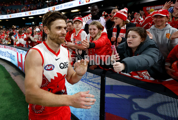 MELBOURNE, AUSTRALIA - MAY 23: Dane Rampe of the Swans celebrates with fans during the 2024 AFL Round 11 match between the Western Bulldogs and the Sydney Swans at Marvel Stadium on May 23, 2024 in Melbourne, Australia. (Photo by Michael Willson/AFL Photos)