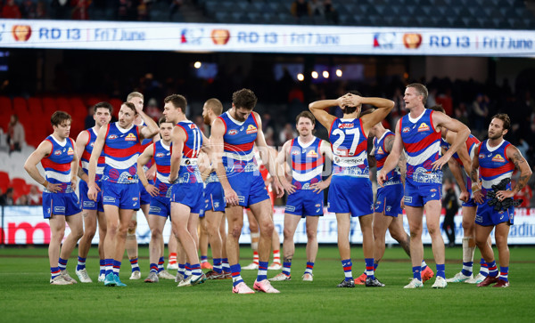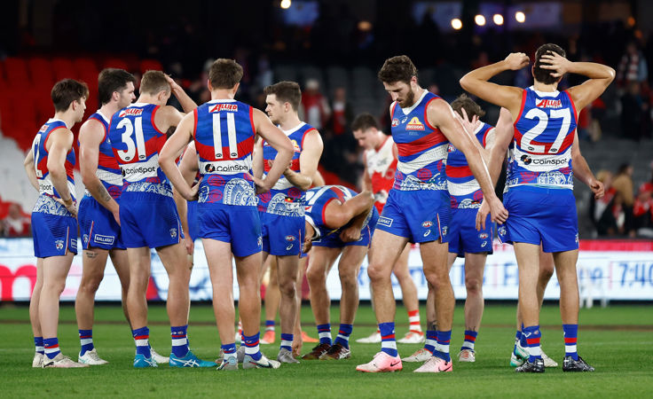 MELBOURNE, AUSTRALIA - MAY 23: The Bulldogs look dejected after a loss during the 2024 AFL Round 11 match between the Western Bulldogs and the Sydney Swans at Marvel Stadium on May 23, 2024 in Melbourne, Australia. (Photo by Michael Willson/AFL Photos)