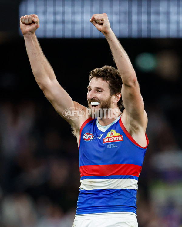 MELBOURNE, AUSTRALIA - MAY 31: Marcus Bontempelli of the Bulldogs celebrates a win after the siren during the 2024 AFL Round 12 match between the Collingwood Magpies and the Adelaide Crows at The Melbourne Cricket Ground on May 31, 2024 in Melbourne, Australia. (Photo by Dylan Burns/AFL Photos)