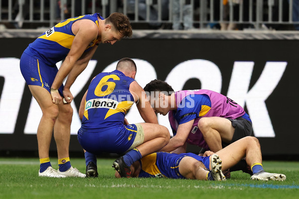 PERTH, AUSTRALIA - JUNE 08: Alex Witherden and Elliot Yeo of the Eagles check on the welfare of Liam Duggan after a collision during the round 13 AFL match between West Coast Eagles and North Melbourne Kangaroos at Optus Stadium, on June 08, 2024, in Perth, Australia. (Photo by Paul Kane/Getty Images via AFL Photos)