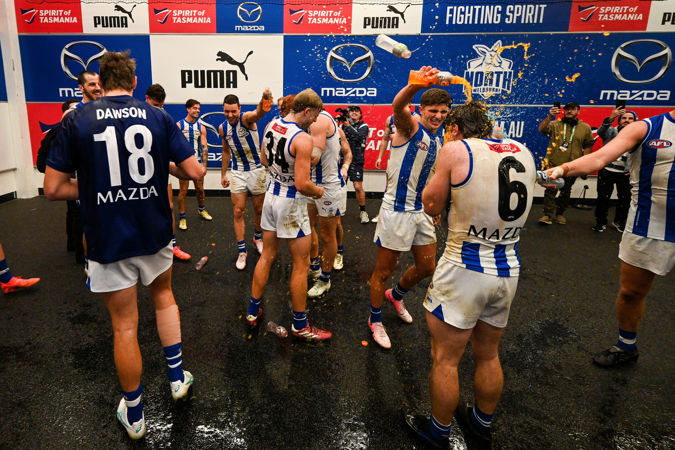 PERTH, AUSTRALIA - JUNE 08: The Kangaroos celebrate with the team song during the 2024 AFL Round 13 match between the West Coast Eagles and the North Melbourne Kangaroos at Optus Stadium on June 08, 2024 in Perth, Australia. (Photo by Daniel Carson/AFL Photos)