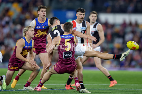 BRISBANE, AUSTRALIA - JUNE 14: Marcus Windhager of the Saints is tackled by Josh Dunkley of the Lions during the 2024 AFL Round 14 match between the Brisbane Lions and the St Kilda Saints at The Gabba on June 14, 2024 in Brisbane, Australia. (Photo by Russell Freeman/AFL Photos)