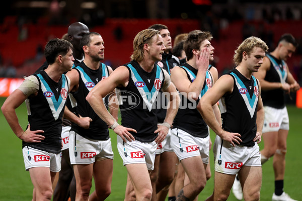 SYDNEY, AUSTRALIA - JUNE 16: Power players react as they leave the field during the round 14 AFL match between Greater Western Sydney Giants and Port Adelaide Power at ENGIE Stadium, on June 16, 2024, in Sydney, Australia. (Photo by Brendon Thorne/AFL Photos)