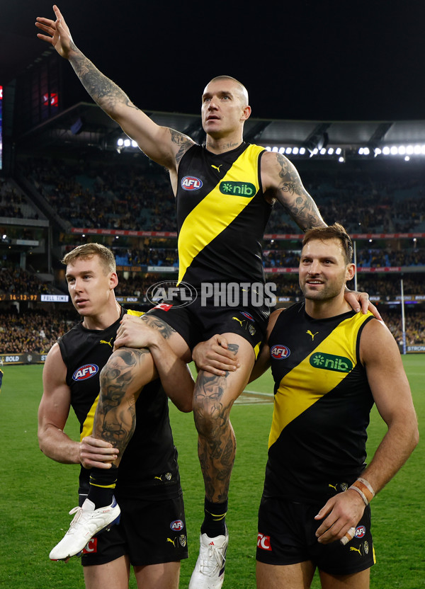 MELBOURNE, AUSTRALIA - JUNE 15: Dustin Martin of the Tigers is chaired from the field after his 300th match by teammates Tom Lynch (left) and Toby Nankervis (right0 during the 2024 AFL Round 14 match between the Richmond Tigers and the Hawthorn Hawks at The Melbourne Cricket Ground on June 15, 2024 in Melbourne, Australia. (Photo by Michael Willson/AFL Photos)
