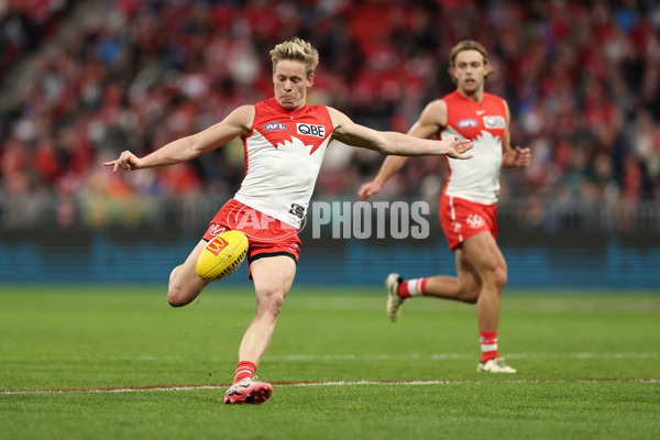 SYDNEY, AUSTRALIA - JUNE 22: Isaac Heeney of the Swans kicks during the round 15 AFL match between Greater Western Sydney Giants and Sydney Swans at ENGIE Stadium, on June 22, 2024, in Sydney, Australia. (Photo by Cameron Spencer/Getty Images via AFL Photos)